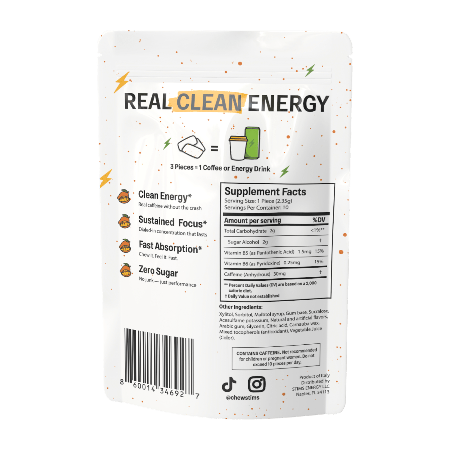 Each piece of STIMS gum contains 30mg of clean caffeine. That means just 3 pieces = the same kick as a cup of coffee or energy drink—but with none of the sugar, calories, or crash.